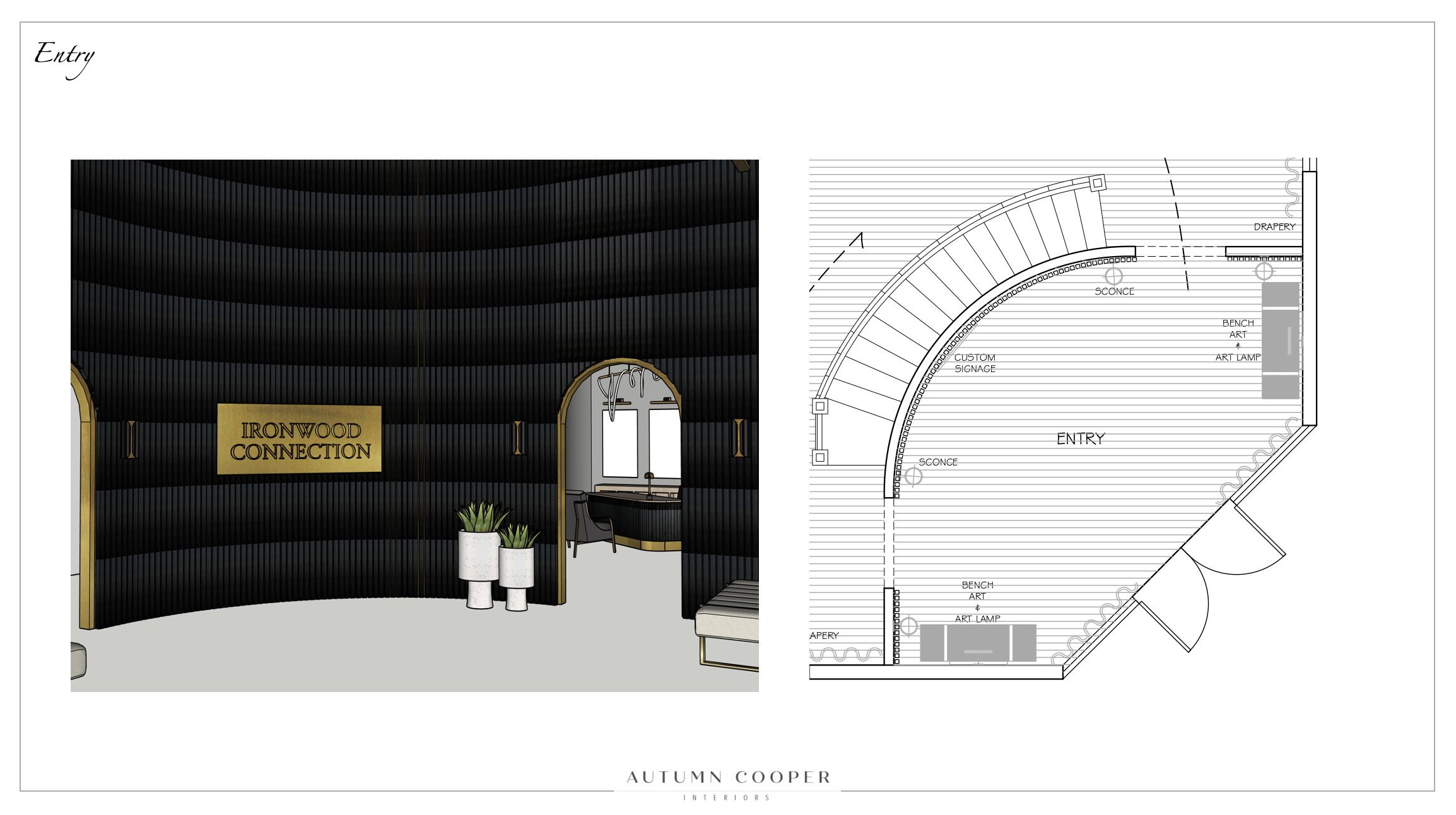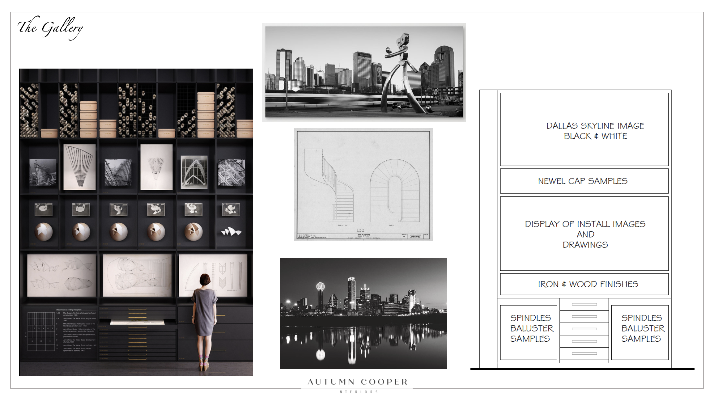 IRONWOOD CONNECTION is a showroom in North Dallas catering to the residential market for custom stair railing design, fabrication, and installation. I was hired to design the showroom space to reflect an art gallery meets luxury hotel. Construction for the space TBD.